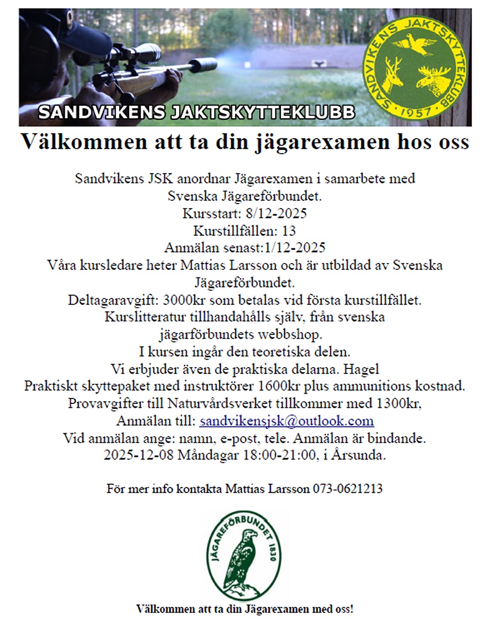 Du som önskar bli examinerad i Jägarexamen kan anmäla ditt intresse via mail, sandvikensjsk@outlook.com. Så återkommer vi med tidpunkt för examination.